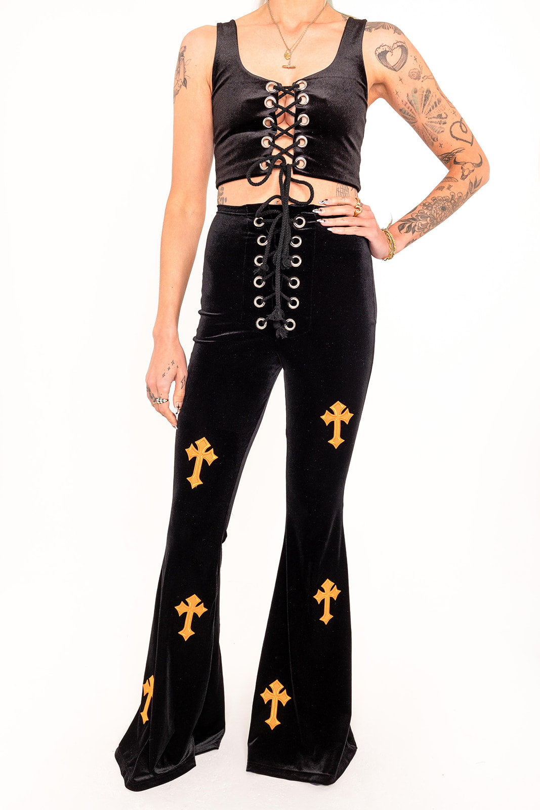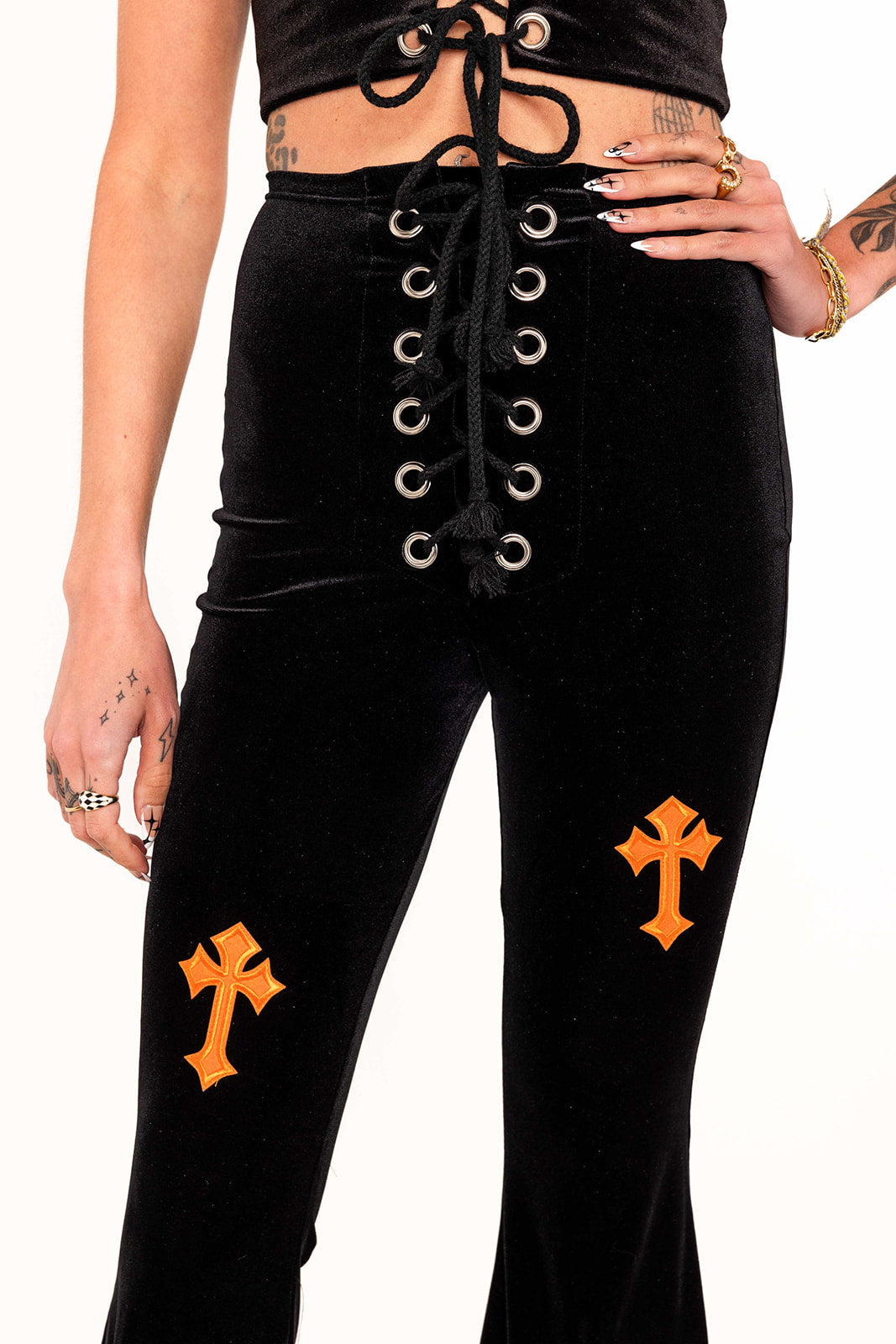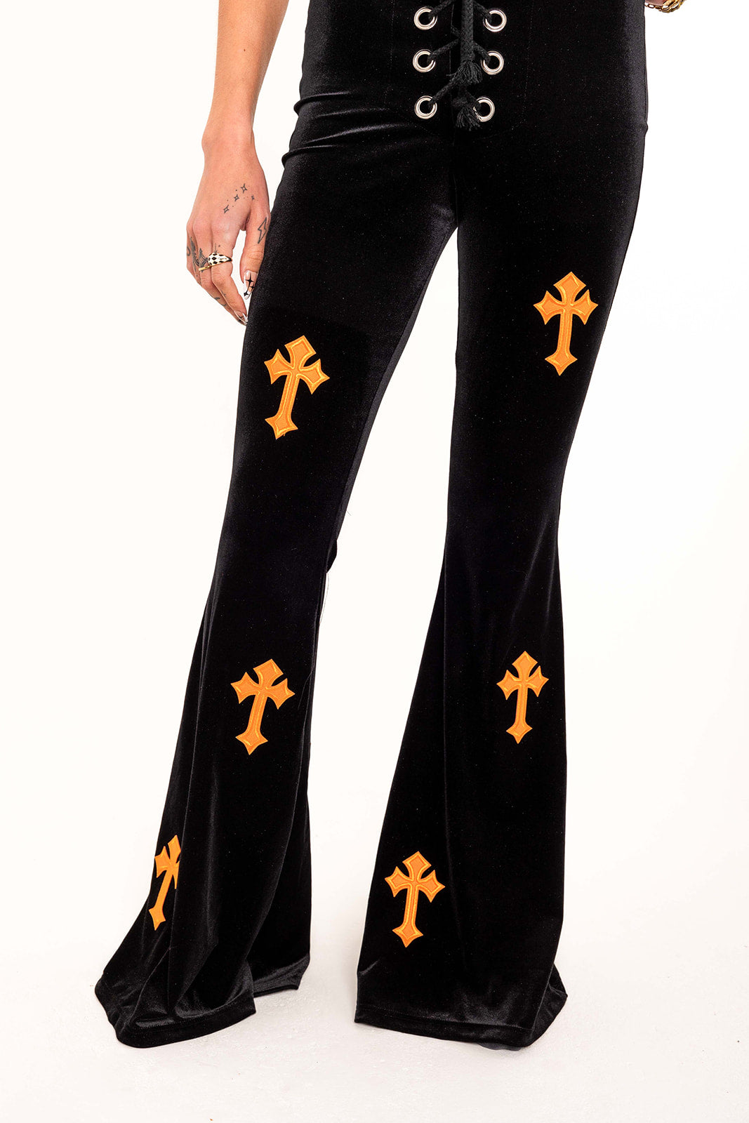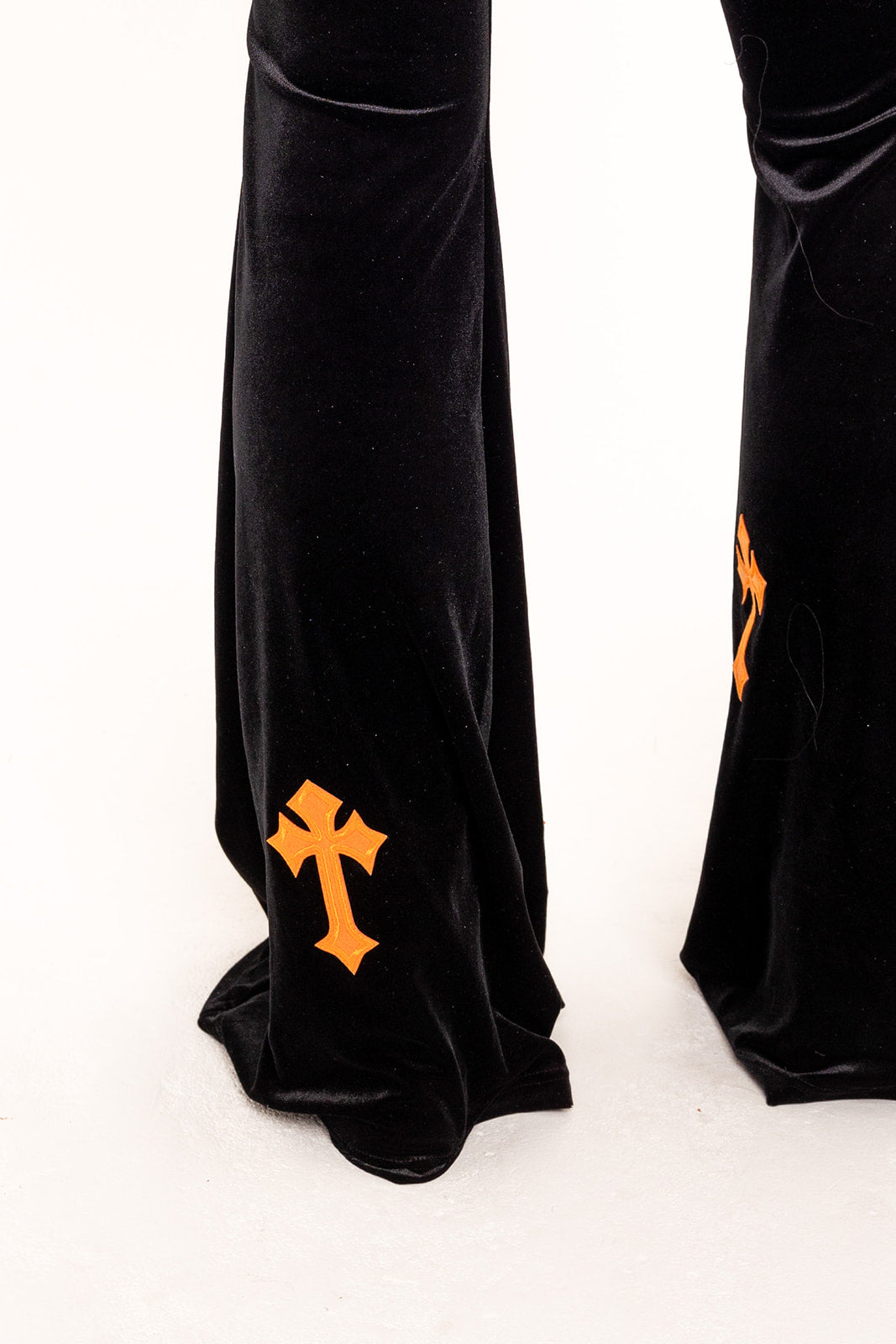 The NEW Buffy style in Black Velvet and Orange embroidered cross detail is a bold and captivating choice. These flares are intended to make a statement with their fierce and ready to slay design.