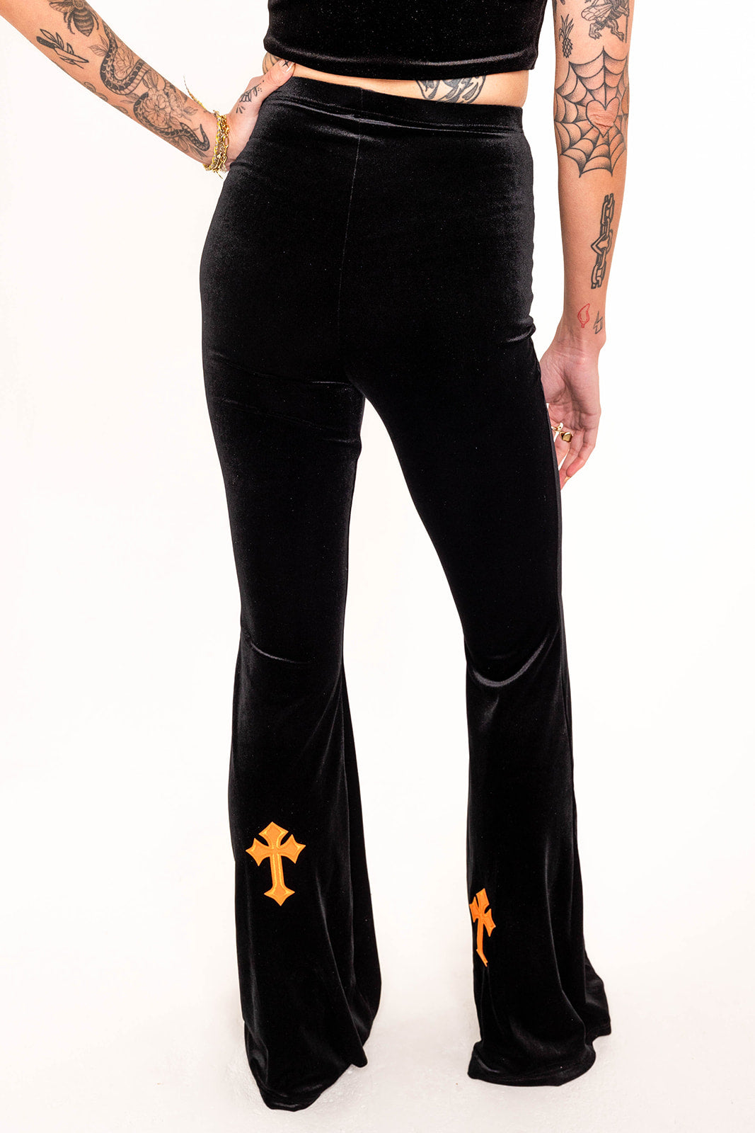 The NEW Buffy style in Black Velvet and Orange embroidered cross detail is a bold and captivating choice. These flares are intended to make a statement with their fierce and ready to slay design.