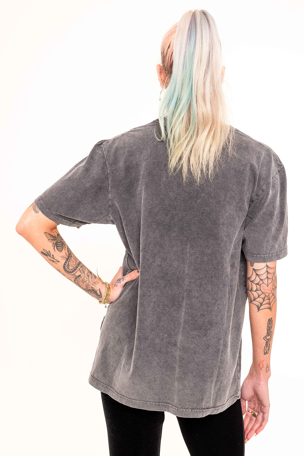 Super soft tee with large chest screen print and adjustable lace up detail.