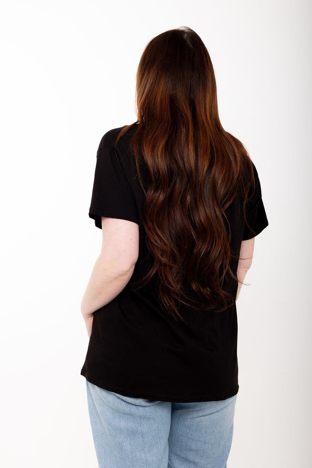 Super soft tee with large chest screen print and adjustable lace up detail.