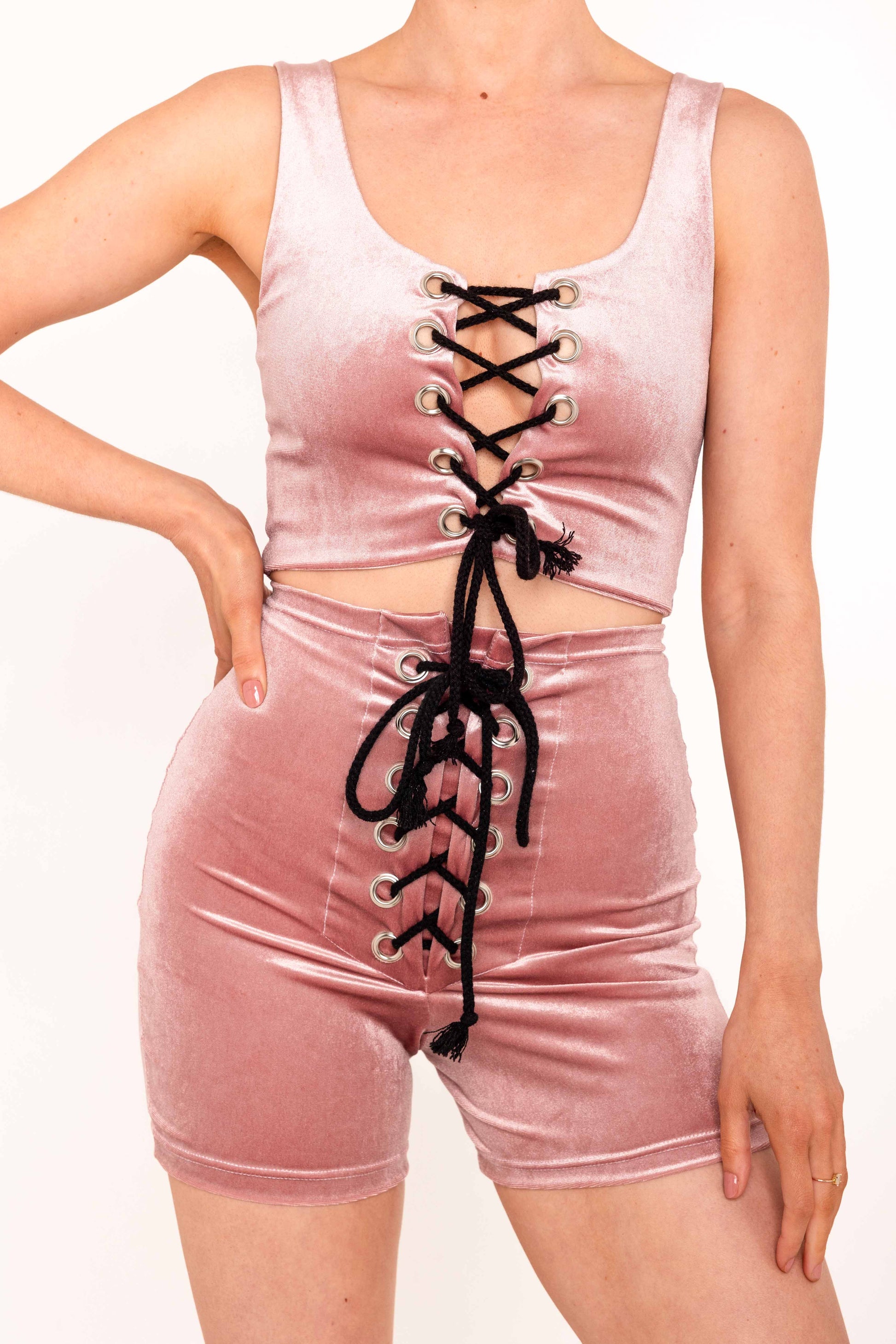 Made from luxurious stretch velvet and featuring front lace-up eyelets, the Stevie Shorts are comfortable and adjustable.