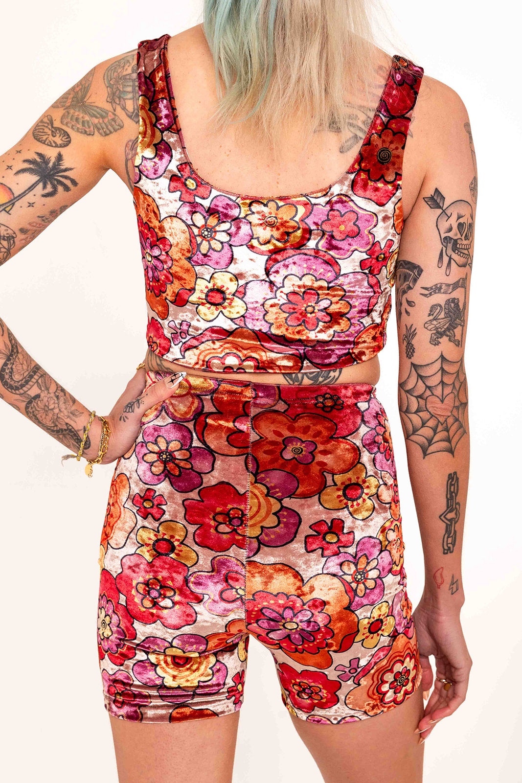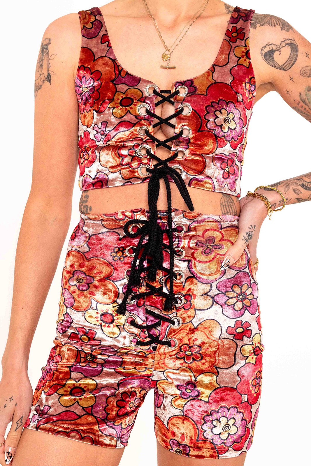 Made from luxurious stretch velvet and featuring front lace-up eyelets, the Stevie Shorts are comfortable and adjustable.