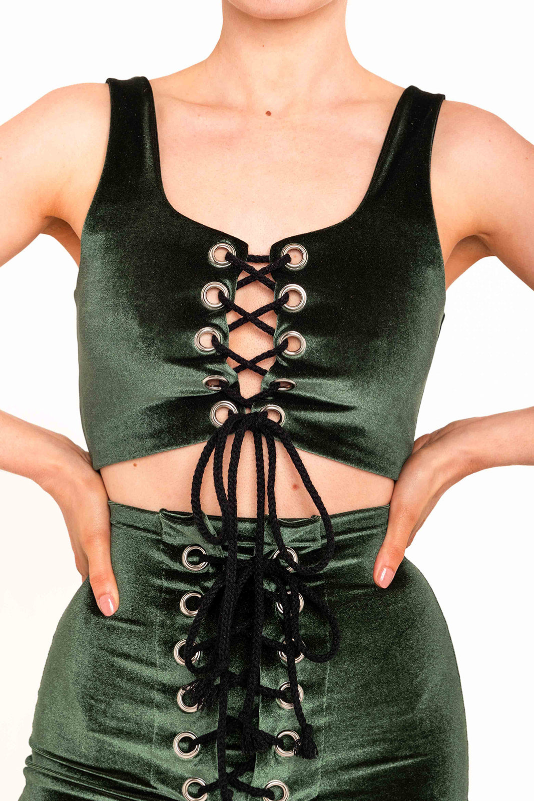 Made from luxurious stretch velvet and featuring front lace-up eyelets, the Stevie Shorts are comfortable and adjustable.